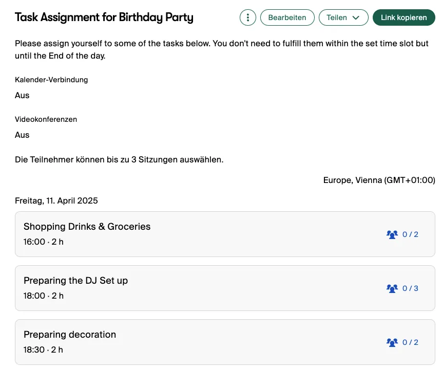 Each session could include specific details like date, time, duration, location, and maximum number of participants. Additionally, Doodle allowed her to decide whether the participant list should be public or private and to limit the number of attendees per session.